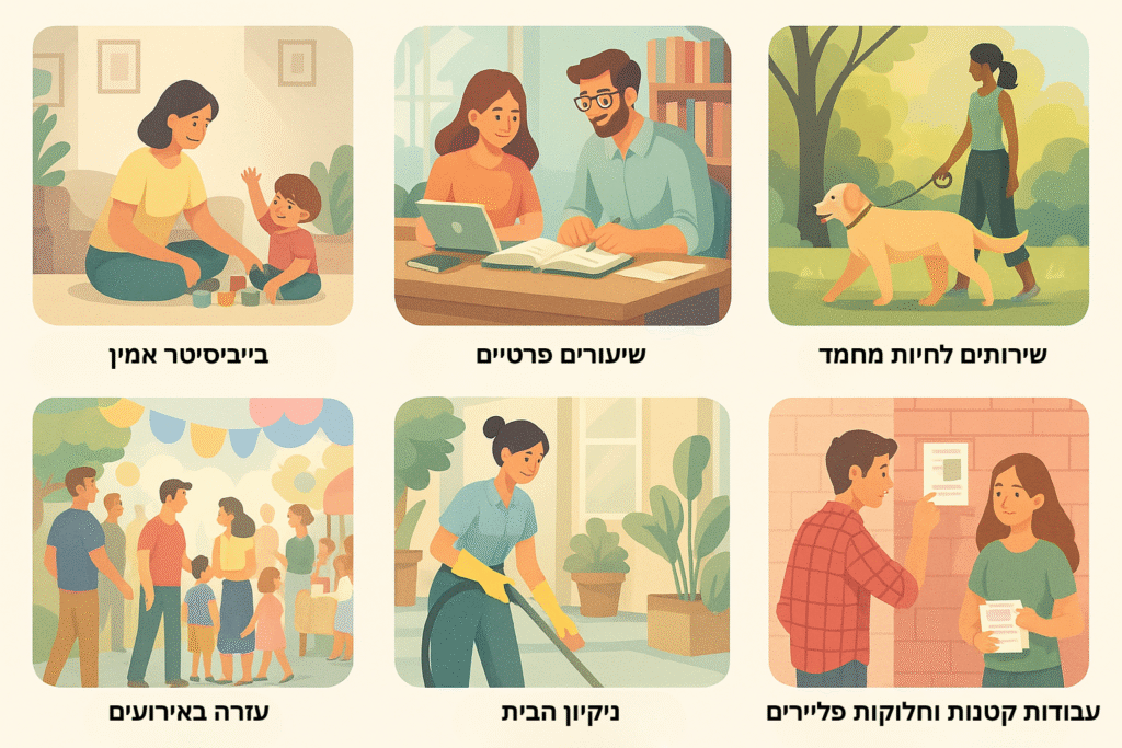 אנחנו מציעים מגוון רחב של שירותים יומיומיים: בייביסיטר, טיפול והליכה עם חיות מחמד, שיעורים פרטיים, עזרה באירועים, ניקיון הבית ועבודות קטנות. כל השירותים שלנו מקומיים ומותאמים לצרכים שלך.